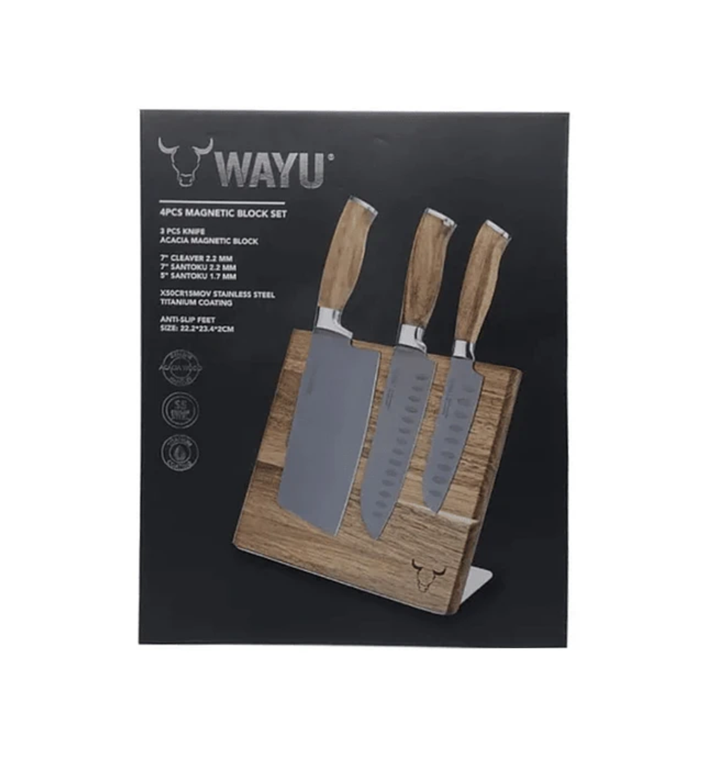 Nuestro Block Magnético Wayu combina calidad y elegancia con tres cuchillos de acero inoxidable y mangos de madera de acacia. Su diseño magnético evita deslizamientos y garantiza seguridad en la cocina.