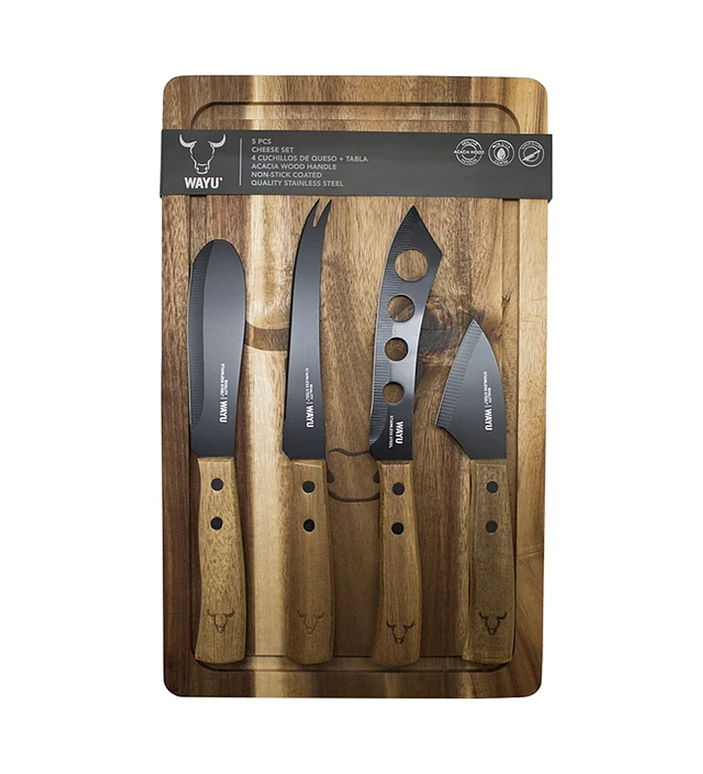 Este completo set incluye 4 cuchillos para aperitivos y una tabla de dimensiones 33 x 20 x 1,8 cm. Los cuchillos cuentan con mangos de madera de acacia y hojas de acero inoxidable. La tabla está fabricada en madera de acacia.